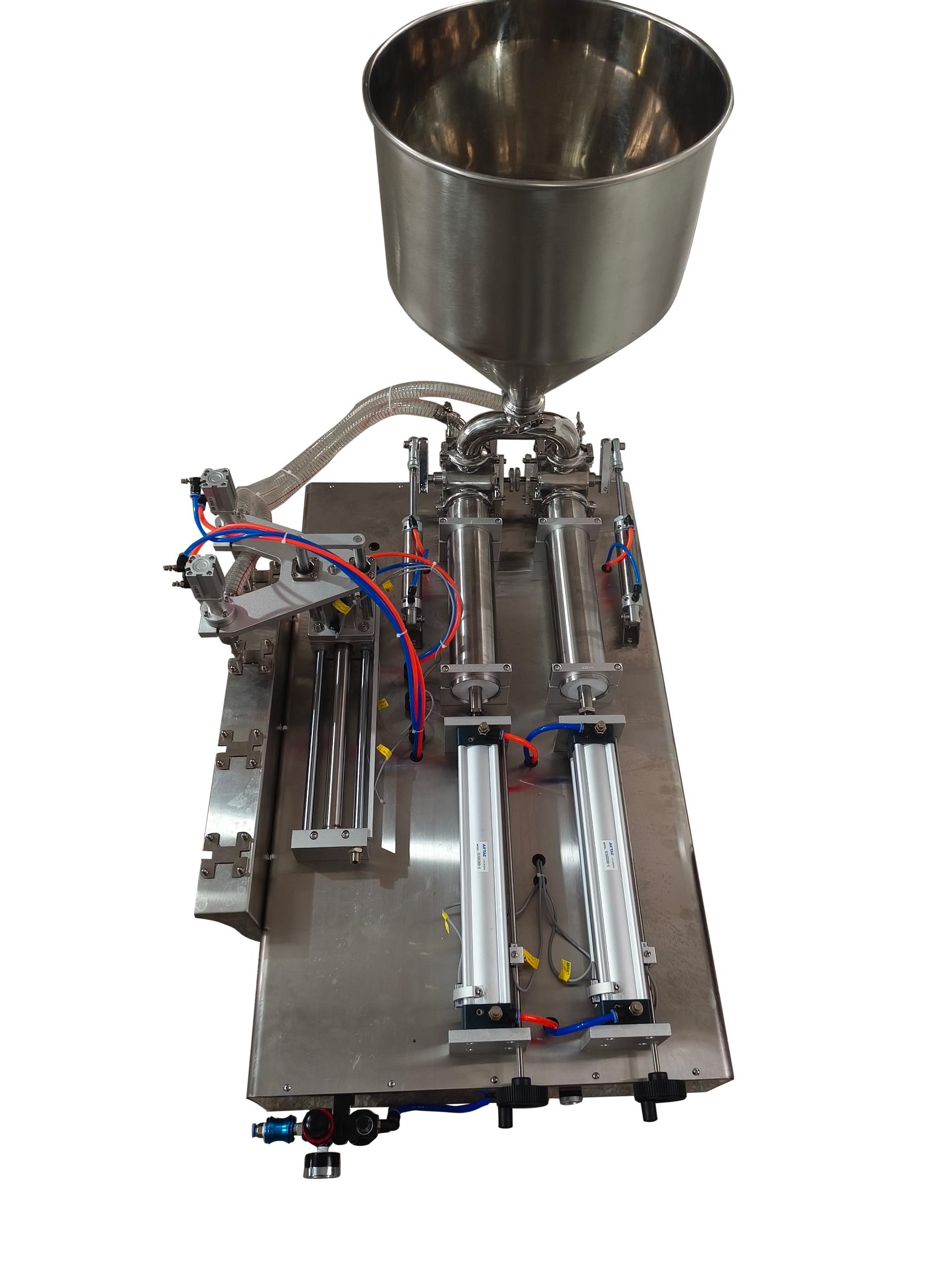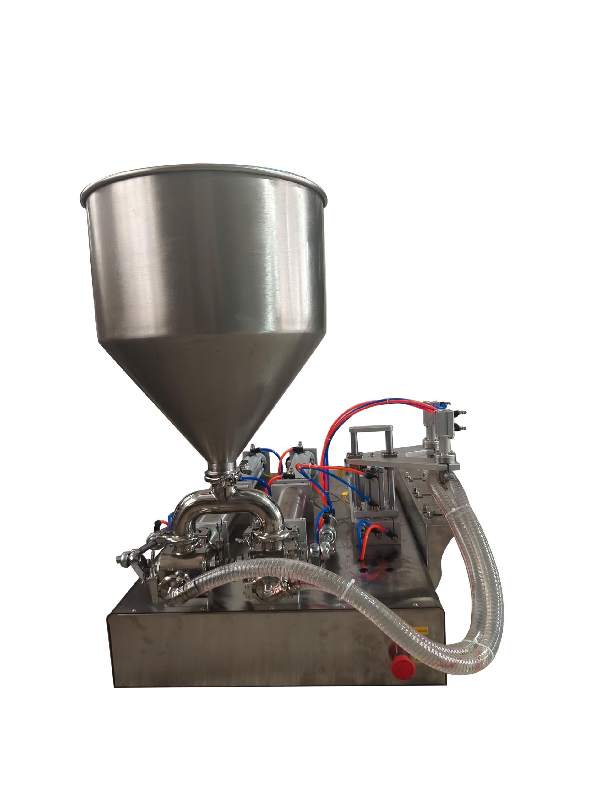 本機為半自動活塞式灌裝機,通過氣缸帶動一個活塞往復運動來抽取和打出物料,采用轉閥控制物料流向,用磁性開關控制氣缸的行程,可調節灌裝量,可以調解汽缸的進氣量實現快速或者慢速灌裝。
