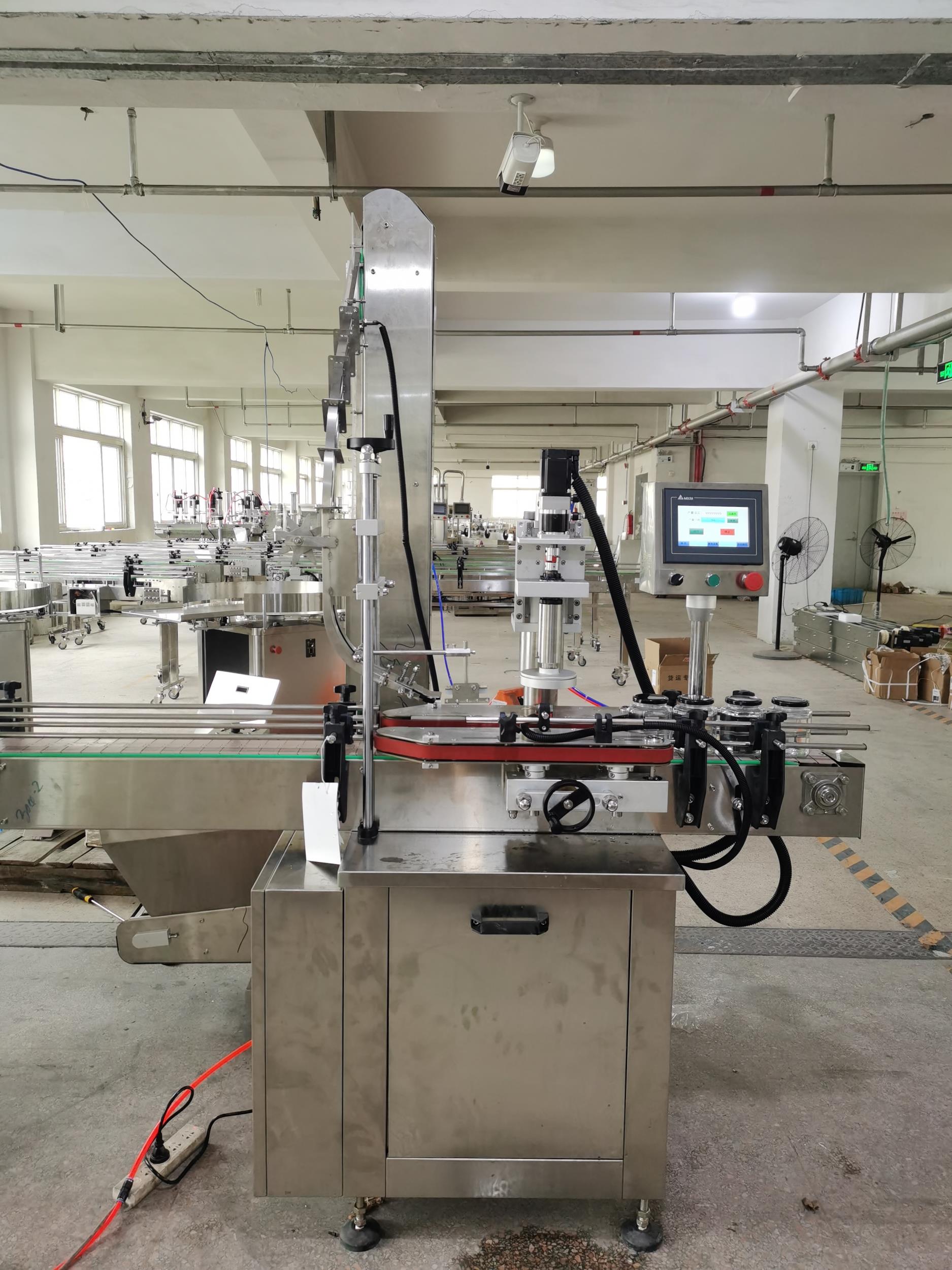 當瓶子進入輸送線后,由兩邊的輸送帶夾瓶輸送,同步輸送定位精準,旋蓋壓力可調整。結構緊湊、合理,方便與其它設備聯動成線。也可以選配上蓋機。