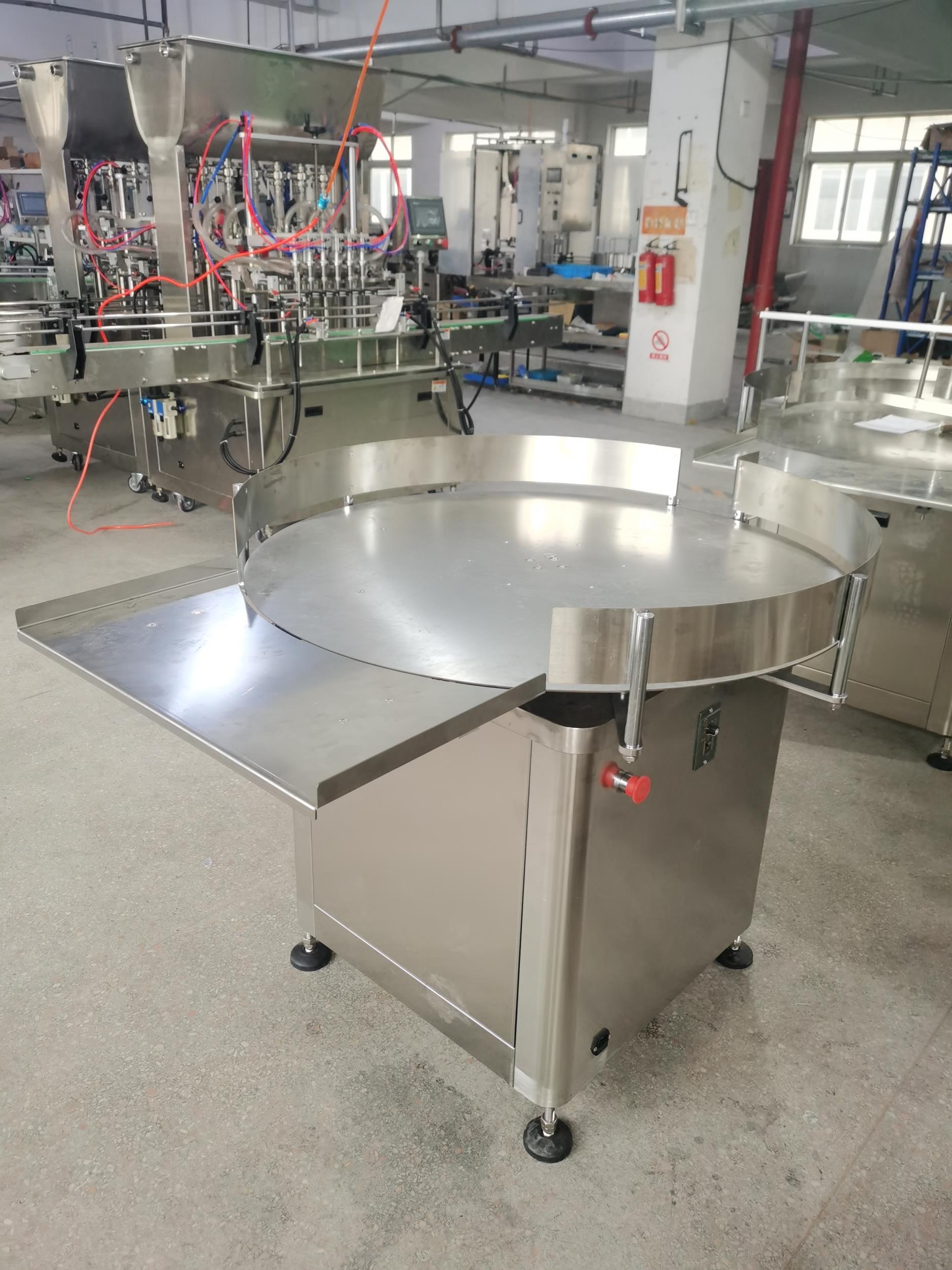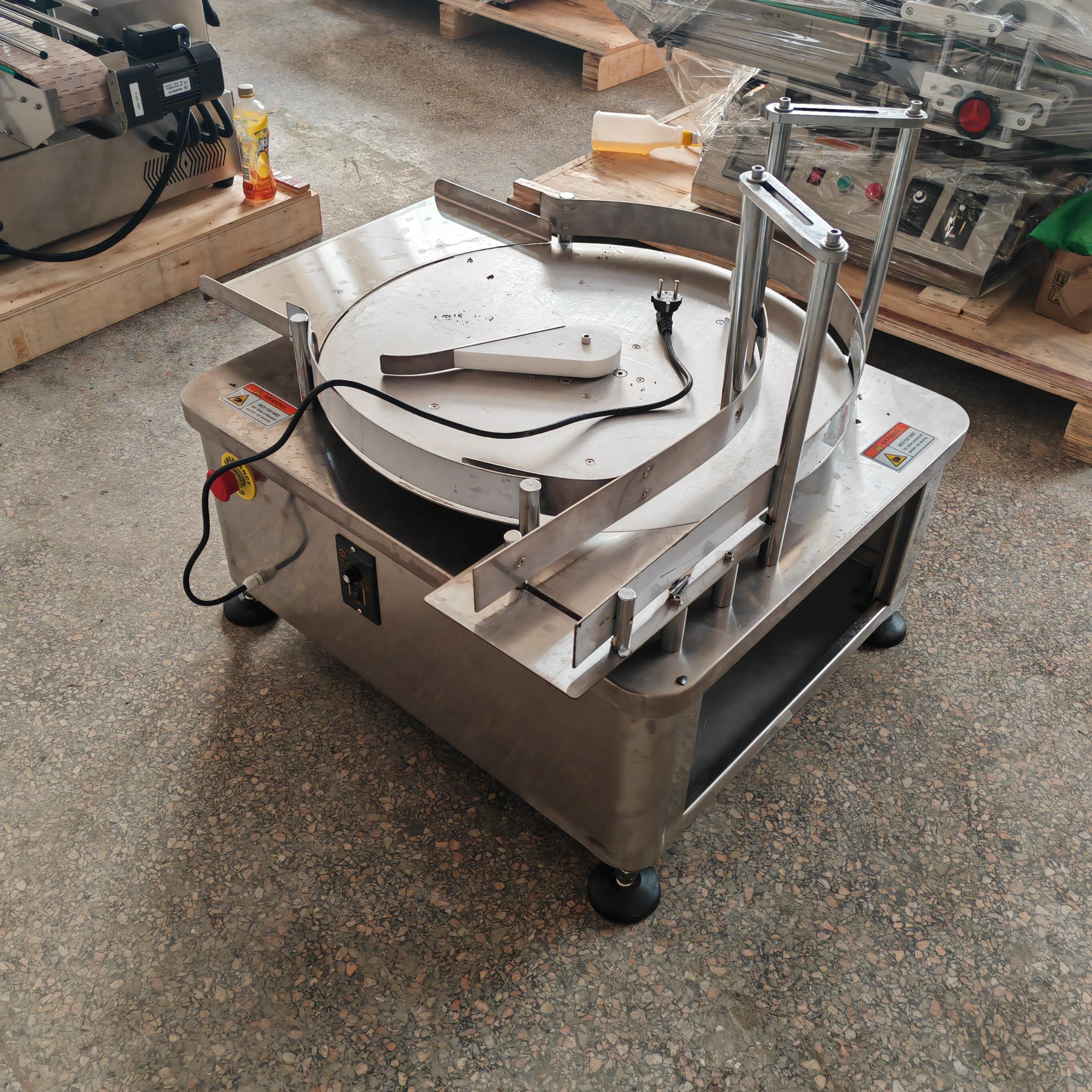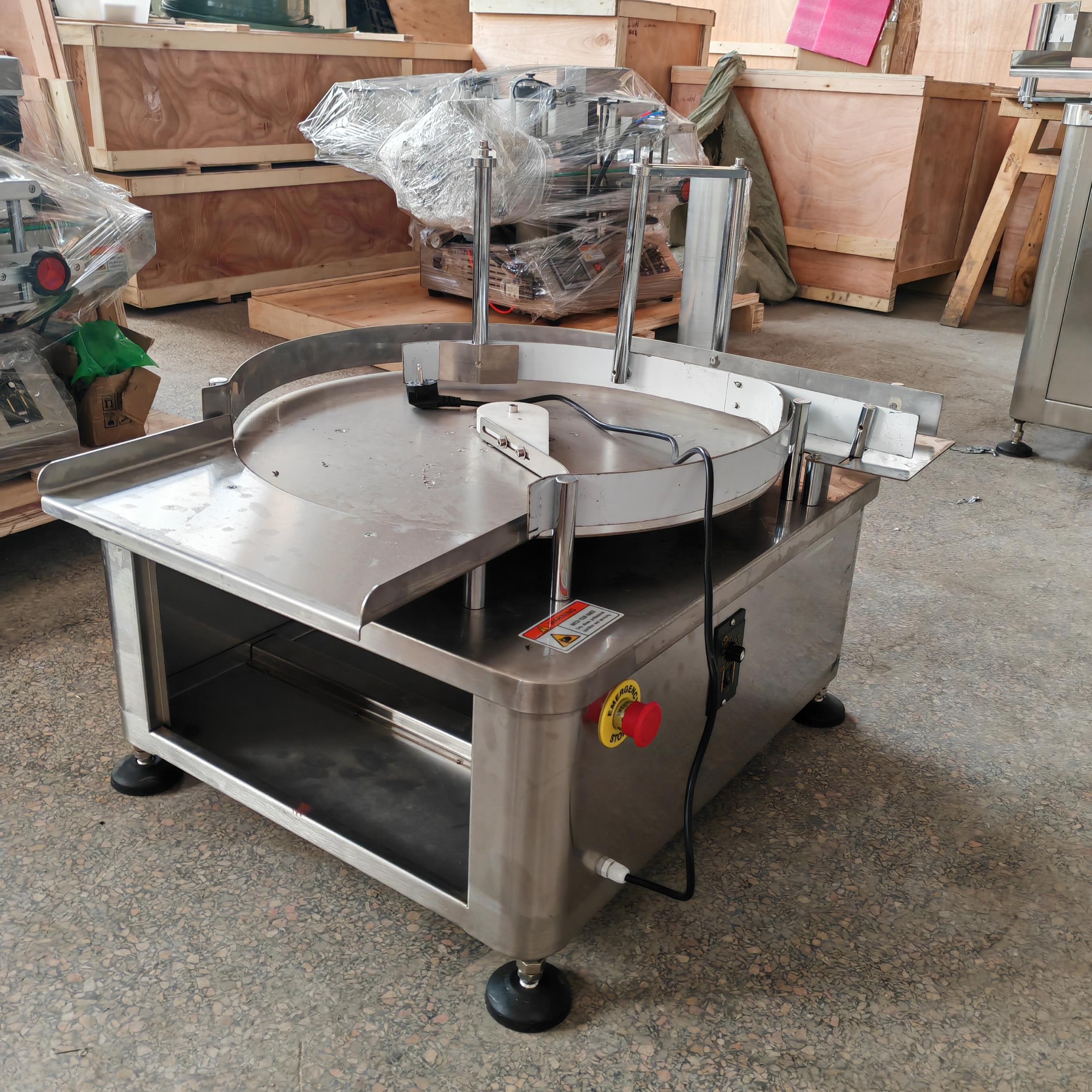 是通過圓盤的旋轉,把圓盤上凌亂的瓶子有序地撥入下一道工序的輸送帶上,并具有緩沖作用。該機操作簡單,移動方便,易維修。